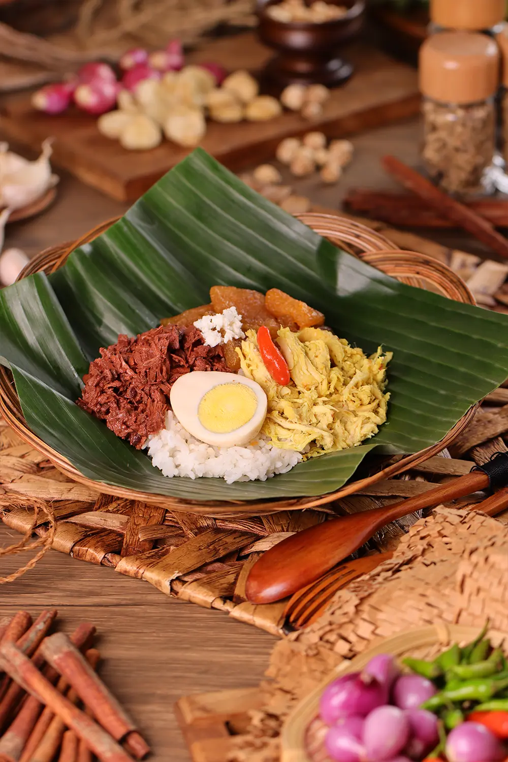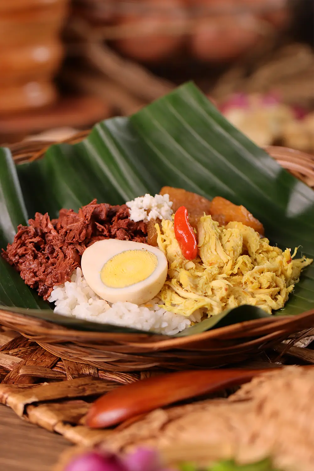 - Ayam Opor Suwir: Potongan daging ayam suwir yang dimasak dengan bumbu opor kaya rempah, menyatu sempurna dengan nasi gudeg.